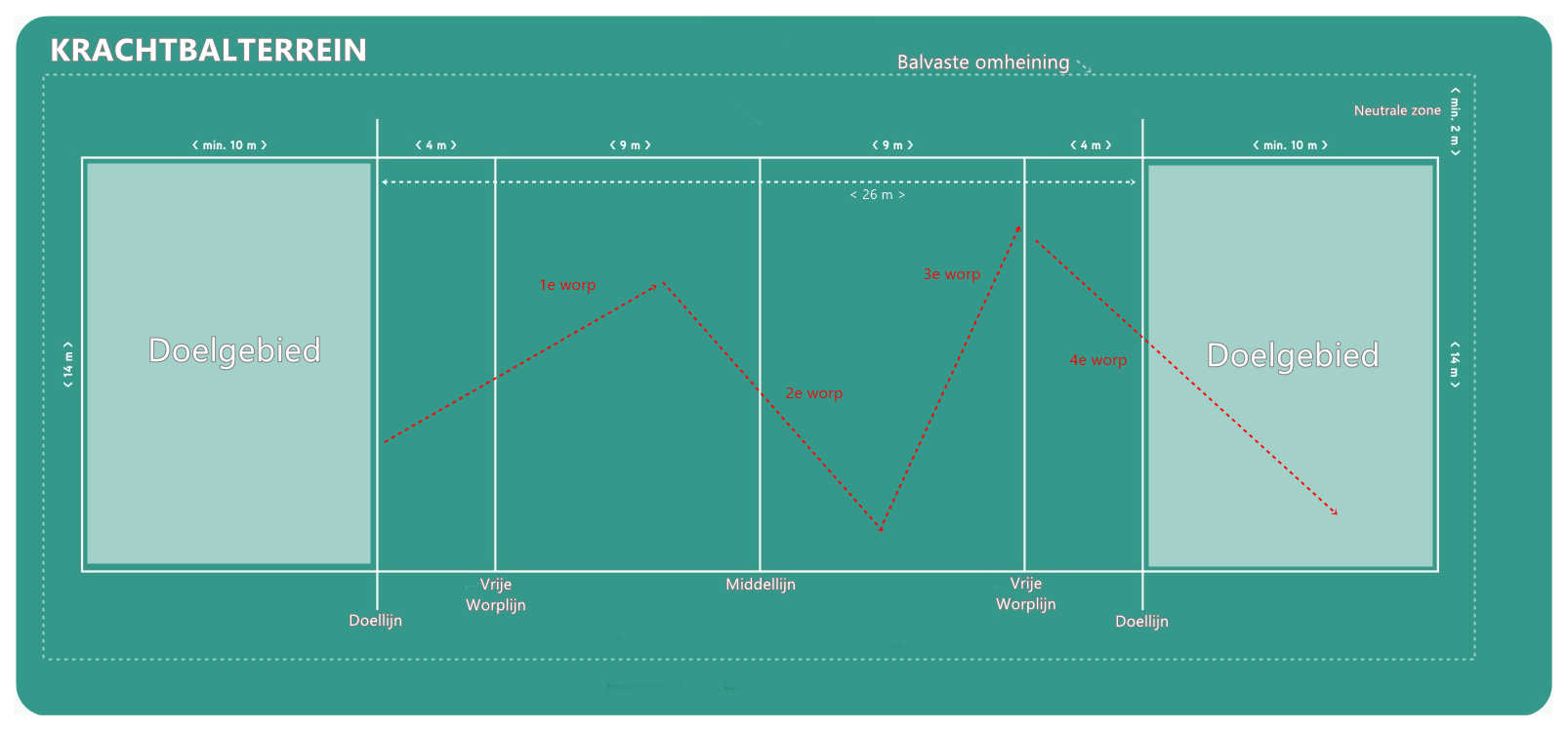 4. Aantal worpen: ngl. de leeftijd en geslacht wordt het aantal worpen aangepast. Het max. aantal is 4 worpen bij de jeugd, 3 bij de hoogste catn. Als het max. aantal worpen gebruikt is, gaat de bal automatisch naar het andere team.